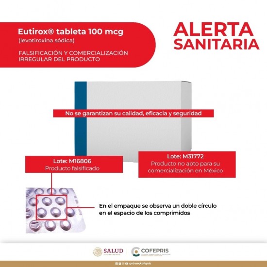 Cofepris indicó que Merck Biopharma Distribution informó a la autoridad sanitaria sobre varios reportes de ineficacia de Eutirox (levotiroxina sódica) tableta 100 mcg, correspondiente al lote M16806. “Los productos de este lote presentan diversas irregularidades en sus empaques primario y secundario, entre ellos, un doble círculo en el blíster que contiene los comprimidos, indicando que estos productos son falsificados.” Además, la empresa titular del registro sanitario notificó a la Cofepris que el lote M31772 no fue liberado para el mercado mexicano, lo que hace que su comercialización sea ilegal. “Consumir estos productos irregulares pone en riesgo la salud de los pacientes con hipotiroidismo, ya que se desconoce la procedencia, condiciones de fabricación, almacenamiento y transporte, así como las materias primas con las que fueron elaborados, lo que compromete su calidad, eficacia y seguridad.” La agencia detalló que el hipotiroidismo es una enfermedad que ocurre cuando la glándula tiroides no produce suficiente hormona T4, ocasionando síntomas como colesterol elevado, depresión, fatiga, caída de cabello, pérdida de la memoria, resequedad extrema en la piel y estreñimiento, entre otros. La Cofepris recomendó no adquirir Eutirox (levotiroxina sódica) tableta 100 mcg con los números de lote M31772 y M16806, sin importar su fecha de caducidad. Además recomendó que si se cuenta con información sobre la posible comercialización de estos productos irregulares, “realice la denuncia sanitaria correspondiente”. Recomendó que para verificar la autenticidad del medicamento, se debe consultar al titular del registro sanitario en la página de Consulta de Registros Sanitarios. Asimismo, la comisión federal exhortó a distribuidores y farmacias abstenerse de adquirir Eutirox (levotiroxina sódica) tableta 100 mcg con los números de lote M31772 y M16806, y asegurarse de adquirir medicamentos únicamente con proveedores autorizados y validados por la empresa titular del registro sanitario, quienes deben contar con licencia sanitaria, aviso de funcionamiento y documentación que acredite la legítima adquisición del producto. |