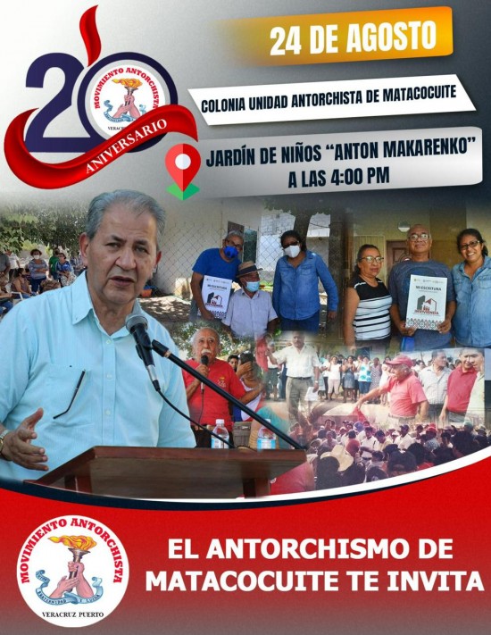 El Movimiento Antorchista se del puerto de Veracruz se prepara para celebrar el 20 aniversario de la colonia Unidad Antorchista de Matacocuite por lo que preparan un evento político-cultural que se realizará el 24 de agosto en el domo del Jardín de niños “Amtón Makarenko” ante la presencia de los colonos y activistas del Movimiento Antorchista, encabezados por su líder histórico Ing. Samuel Aguirre Ochoa. En este sentido, los líderes populares de la colonia y del antorchismo seccional preparan un evento que contará con un discurso del histórico líder del antorchismo veracruzano, el Ing. Samuel Aguirre Ochoa, con presentaciones artísticas y culturales así como con la característica alegría jarocha. Además los vecinos destacaron que el motivo principal de esta celebración es celebrar 20 años de lucha organizada en las filas del Movimiento Antorchista. En este evento se destacarán los logros obtenidos a través de la lucha organizada de colonos, estudiantes y maestros, quienes a lo largo de 20 años han luchado y logrado el desarrollo de su colonia y mejores condiciones de vida, pues tener un patrimonio, obras y servicios, escuelas desde kinder hasta bachillerato, espacios deportivos y culturales así como talleres, entre otros beneficios. Por último, el pleno representante de la colonia hizo una invitación pública para que asistan al gran evento de aniversario. “Se hace extensiva la invitación a este festejo para el sábado 24 de agosto en punto de las 4 de la tarde en el Jardín de Niños “Anton Makarenko”, de la misma colonia. Están todos invitados y ojalá puedan acompañarnos y palpar ustedes mismos los grandes logros que ha conquistado el pueblo organizado”. |