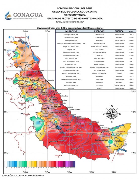 La Comisión Nacional de Agua, Organismo Cuenca Golfo informó que, en las últimas 24 horas, en Tuxpan cayeron 206.3 milímetros de lluvia, lo que equivale a 206.3 litros por metro cuadrado.