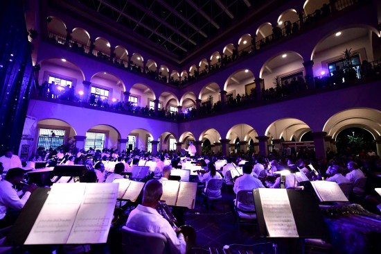 Xalapa, Ver.- Autoridades municipales encabezadas por el alcalde Ricardo Ahued Bardahuil asistieron al concierto que ofreció la Orquesta Sinfónica de Xalapa (OSX) en el patio central de Palacio Municipal para celebrar el 80 aniversario de la Universidad Veracruzana (UV) y el 95 aniversario de esta emblemática agrupación.