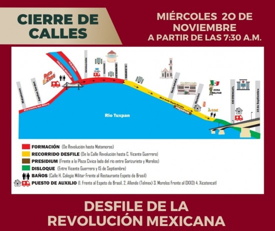 Tuxpan, Ver.- El gobierno municipal informa que este miércoles 20 de noviembre, a partir de las 7:30 de la mañana, la Dirección de Tránsito Municipal implementará un operativo de cierre vial para llevar a cabo el desfile conmemorativo por el 114 aniversario de la Revolución Mexicana.