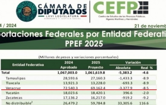 XALAPA.- Según un análisis del Centro de Estudios de las Finanzas Públicas Ifigenia Martínez y Hernández de la Cámara de Diputados, sobre los recursos del Ramo 33, los estados del país tendrán caídas reales en el ejercicio fiscal 2025 respecto de los montos que se les aprobaron en 2024. De acuerdo con el estudio, a Veracruz se le aprobaron 72 mil 540.3 millones de pesos de aportaciones federales en 2024 pero el Proyecto de Presupuesto de Egresos de la Federación (PPEF) 2025 propone que se le destinen 69 mil 162.4 millones de pesos en 2025, es decir, 3 mil 337.9 millones de pesos menos, lo que significará (-)8.5 por ciento en términos reales. De igual forma, el PPEF 2025 propone que la Ciudad de México reciba 6 mil 484.0 millones de pesos menos de aportaciones federales en el ejercicio fiscal 2025 respecto de lo que se le aprobó en 2024, que fueron 79 mil 172.6 millones de pesos, lo que representará una variación real de (-)11.9 por ciento. Al Estado de México se propone destinar 93 mil 472.9 millones de pesos de aportaciones federales en el 2025, monto que será menor en 9 mil 526.9 millones de pesos a lo que se le aprobó en este 2024, que fueron 102 mil 999.7 millones de pesos, por lo que registrará una caída real de (-)13 por ciento. En el mismo sentido, el Centro de Estudios de las Finanzas Públicas prevé que las aportaciones federales para Oaxaca caerán 9.5 por ciento para el ejercicio fiscal 2025, ya que se propone aprobarle 53 mil 781.4 millones de pesos, lo que significará 3 mil 226.8 millones de pesos menos respecto de los 57 mil 8.2 millones de pesos que se le autorizaron para este 2024. Así las cosas.