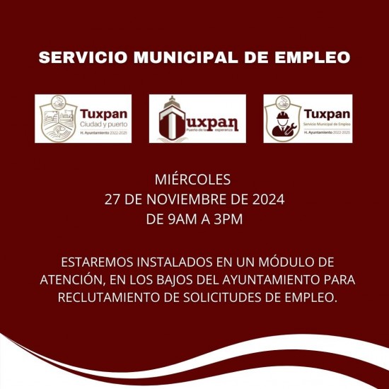 Tuxpan, Ver.- El Servicio Municipal de Empleo instalará una mesa de atención para reclutamiento en planta baja de presidencia municipal, este miércoles 27 de noviembre de 9:00 a 15:00 horas.