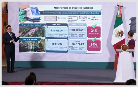 El general Óscar David Lozano Águila, director general de la empresa Tren Maya, adscrita a la Secretaría de la Defensa Nacional, informó que se trata de 10 paquetes –con precios de 8 mil 916 pesos a 14 mil 500– para visitar zonas arqueológicas, pueblos mágicos, ciudades, espacios naturales, playas, cenotes y otras zonas que hay a lo largo de los cinco estados del sureste que recorre este ferrocarril. La idea es transmitir y vivir la cultura maya como eje de una experiencia turística inolvidable, señaló el militar en la conferencia de la presidenta Claudia Sheinbaum Pardo. Señaló que incluyen vuelos desde el Aeropuerto Internacional Felipe Ángeles en la aerolínea Mexicana, con 25 por ciento de descuento, y arribo a las terminales aéreas de Palenque, Campeche, Tulum y Chetumal –administradas por la Sedena– y a dos privados que son los de Mérida y Cancún; hospedaje en los hoteles Tren Maya y traslados en el ferrocarril con una tarifa de 50 por ciento de descuento para turistas nacionales. Describió dos de los 10 paquetes con cuatro días y tres noches. Uno llamado Joyas de la cultura mesoamericana, que incluye recorridos por el parque El Jaguar, en Tulum; por la Laguna de los Siete Colores, de Bacalar, y por la zona arqueológica de Calakmul, Campeche, con un costo de 8 mil 916 pesos, más bajo que los 13 mil 478 promedio de la oferta actual en otras empresas. Asimismo, el de La ruta de las maravillas, con visitas a Mérida y Valladolid, y a las zonas arqueológicas de Ek Balam y Chichén Itzá, cuyo precio será de 14 mil 512 pesos, casi 5 mil menos que la competencia. Lozano Águila indicó que habrá actividades, promociones y concursos para conmemorar el primer aniversario del Tren Maya, que fue inaugurado el 15 de diciembre de 2023 por el entonces presidente Andrés Manuel López Obrador, con un recorrido de la estación Mérida-Teya a Cancún. En un gráfico presentado, corroboró que en este año ha transportado a 603 mil 82 pasajeros –un promedio de mil 653 diarios–, la mitad de ellos turistas nacionales. Por su parte, la mandataria federal calificó este proyecto integral de hazaña y símbolo de la transformación que se desarrolló en tres años y permite acceder a la grandeza cultural de la antigua nación maya –que desarrolló el uso del cero en la matemáticas y una imponente arquitectura basada en su visión astronómica– y de los actuales pobladores mayas, al igual que a la riqueza natural de esa parte del país. El próximo domingo, la Presidenta inaugurará el trayecto de Chetumal, Quintana Roo, a Escárcega, Campeche. El titular del Instituto Nacional de Antropología e Historia, Diego Prieto, presentó un video sobre la aportación de los mayas a la matemática y la ciencia universales por la creación del número cero como medida de la nada. |