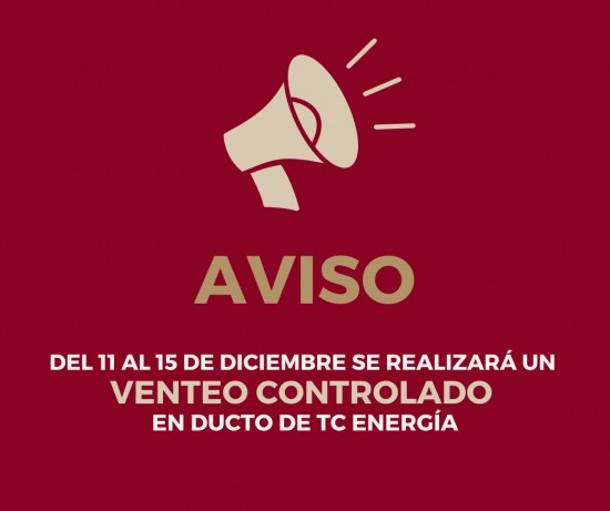 ¡No se alarme! Del 11 al 15 de diciembre se realizará un venteo controlado en ducto de TC Energía. |