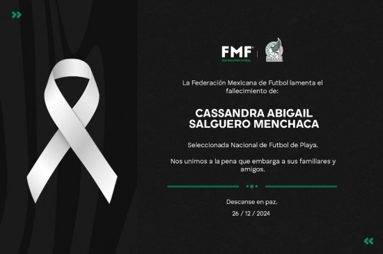 “La FMF y la selección nacional de futbol de playa femenil lamenta el sensible fallecimiento de Cassandra Abigail Salguero Menchaca”, señaló en un mensaje en la red social X.