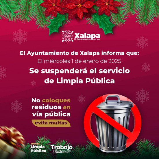 Este miércoles 1 de enero se suspenderá el servicio de recolección, transporte y disposición final de residuos sólidos en el municipio, por lo que se solicita a la ciudadanía no sacar sus desechos a la vía pública, para no generar problemas de imagen urbana, contaminación y evitar multas.
