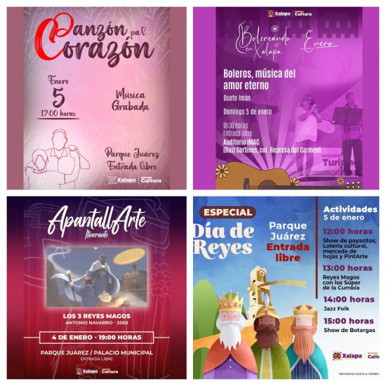 Música, cine, danza y un programa especial por el Día de Reyes, forman parte de las actividades culturales organizadas por el Ayuntamiento para contribuir a la recreación y convivencia de las familias. Este jueves 2 de enero, en las Tardes de Xallitic, se presentan Enrique y Rafa, a las 17:00 horas, en la explanada del Barrio Mágico. En Palacio Municipal, el sábado 4 de enero, a las 19:00 horas, se proyectará “Los Tres Reyes Magos”, una película de Antonio Navarro, como parte del programa “ApantallArte”. El domingo 5 de enero se tiene un programa especial por el Día de Reyes en el parque Benito Juárez. Habrá show de payasitos, Lotería Cultural, Mercado de Hojas y PintArte, desde las 12:00 horas; a las 13:00 horas se presentan Los Súper de la Cumbia. Continuando con este programa, a las 14:00 horas se tendrá un concierto de Jazzfolk, gran combinación para acercar a los más pequeños al mundo de la música. Este programa concluirá con un Show de Botargas a las 15:00 horas. A las 17:00 horas en el parque Juárez se desarrollará otra edición de “Danzón pa´l Corazón”, y a las 18:30 horas, en el auditorio de la IMAC, se presenta el Dueto Imán con el concierto “Boleros, música del amor eterno”. |