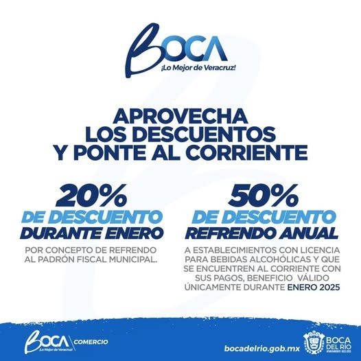 El 20% de descuento durante enero por concepto de refrendo al padrón fiscal municipal y el 50% de descuento refrendo anual a establecimientos con licencia para bebidas alcohólicas y que se encuentren al corriente con sus pagos, beneficio válido únicamente durante enero 2025.