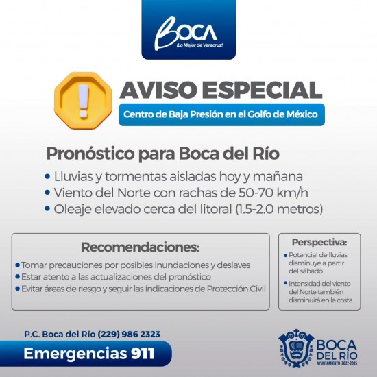 • Lluvias y tormentas aisladas hoy y mañana. • Viento del Norte con rachas de 50-70 km/h • Oleaje elevado del litoral (1.5-2.0 metros) P.C Boca del Río (229) 986 2323 Emergencias 911 |