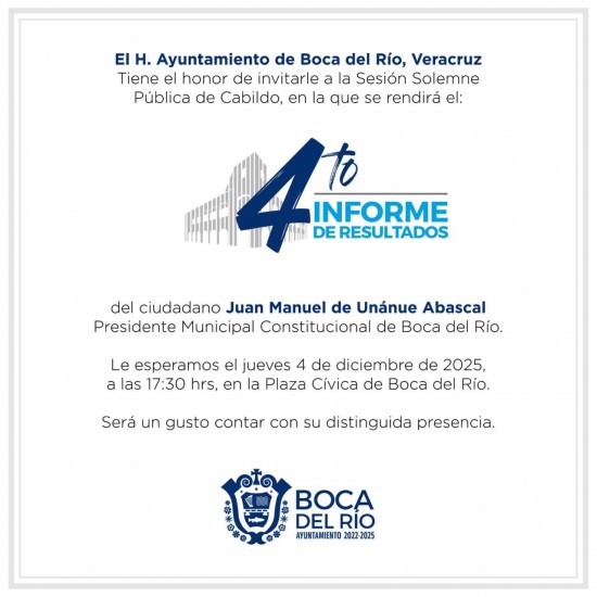 Durante estos cuatro años, la transparencia, la cercanía y el compromiso han sido pilares para impulsar el desarrollo de Boca del Río y fortalecerla como una ciudad más próspera y solidaria. Será un verdadero honor contar con su presencia este jueves 4 de diciembre en el Cuarto Informe de Resultados del Presidente Municipal Constitucional Juan Manuel de Unánue, un espacio para compartir, con apertura y gratitud, los avances que hemos construido junto a la ciudadanía para hacer de nuestra ciudad Lo Mejor de Veracruz. Para confirmar su asistencia, queda a su disposición este medio. Gracias por su respuesta. |