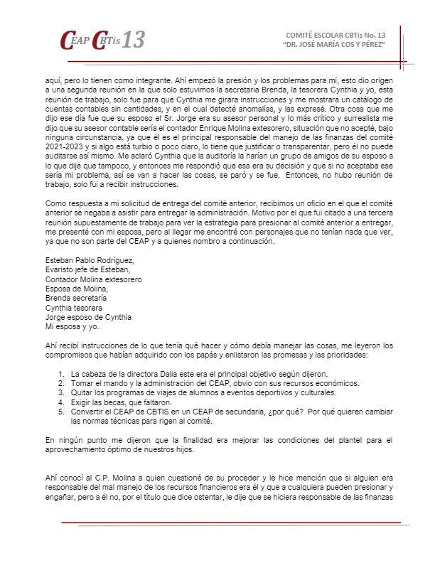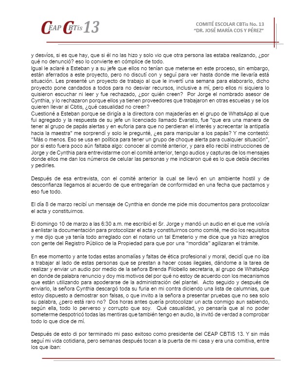 De acuerdo a las normas técnicas que rigen al Comité, legalmente constituido como Asociación Civil, al no haber sido convocada por su presidente, la Asamblea no podía llevarse a cabo, sin embargo se realizó y fue hecha en la vía pública con los riesgos que conlleva, en una afán de Guevara y Filobello por victimizarse, pues la autorización para la utilización de las instalaciones escolares se dio en tiempo y forma. A través de un documento fechado el 24 de abril y distribuido este lunes a los padres de familia, Zaragoza Sariñana explica que el comité al que pertenece nunca fue protocolizado ante notario público, como corresponde legalmente, en su lugar, la tesorera y la secretaria realizaron un acta ante el notario Emeterio López Márquez, en la que el presidente Rodolfo Zaragoza no está incluido, lo que evidencia dolo en su actuar. En el documento de referencia, Zaragoza explica que luego de varias reuniones con ambas personas, buscaban presionarlo y relata que “recibí instrucciones de lo que tenía qué hacer y cómo debía manejar las cosas, me leyeron los compromisos que habían adquirido con el grupo de papás que las apoyaron, enlistaron las promesas y las prioridades”: “La cabeza de la directora Dalia (Pérez) este era el principal objetivo según dijeron”. “Tomar el mando y la administración del CEAP, obvio con sus recursos económicos”. “Quitar los programas de viajes de alumnos a eventos deportivos y culturales”. “Exigir las becas, que faltaron”. “Convertir el CEAP de CBTIS en un CEAP de secundaria, ¿por qué? Por qué quieren cambiar las normas técnicas para rigen al comité”. Debe destacarse que “en ningún punto me dijeron que la finalidad era mejorar las condiciones del plantel para el aprovechamiento óptimo de nuestros hijos”. De forma adicional a este documento, existen grabaciones en audio y video, así como capturas de pantalla de distintos chats en los que se evidencian los verdaderos intereses que mueven a las señoras Cinthya Gabriela Guevara y Brenda Filobello. Rodolfo Zaragoza Sariñana explica que “con esta gente sólo puedo trabajar si estoy dispuesto a participar en tranzas (sic), y no lo voy a hacer” y exhorta ahí mismo a que se nombre otro CEAP “que no esté contaminado”, en el que nadie sea ratificado, sino gente nueva con ganas de trabajar por los alumnos y por el plantel. ![]() ![]() ![]() ![]() ![]() |