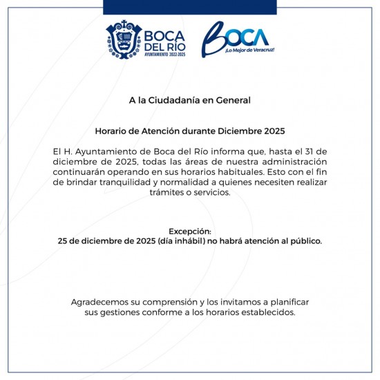 Todas las áreas operarán en horario habitual hasta el 31 de diciembre, excepto el 25 de diciembre (día inhábil) sin atención al público. |