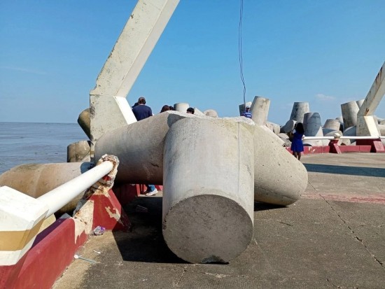 | En las escolleras de área del faro de Coatzacoalcos, uno de los tetrápodos, estructuras de concreto de varias toneladas, fue arrojado por el mar hacia un camino, mientras que otras estructuras similares fueron desplazadas. | ||||||